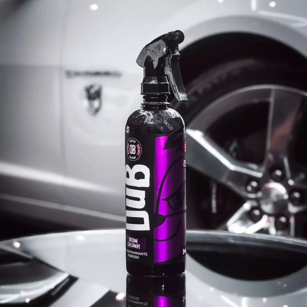 O Iron Skunk da Dub Boyz é um descontaminante ferroso de pH neutro, especialmente formulado para remover partículas ferrosas e fuligem de freios, facilitando a limpeza das superfícies do veículo. Seu diferencial é o baixo teor de odor durante a reação química, tornando-o mais agradável de usar. Este produto pode ser aplicado tanto na pintura quanto em outras partes externas do veículo, garantindo uma limpeza eficaz sem comprometer a superfície.