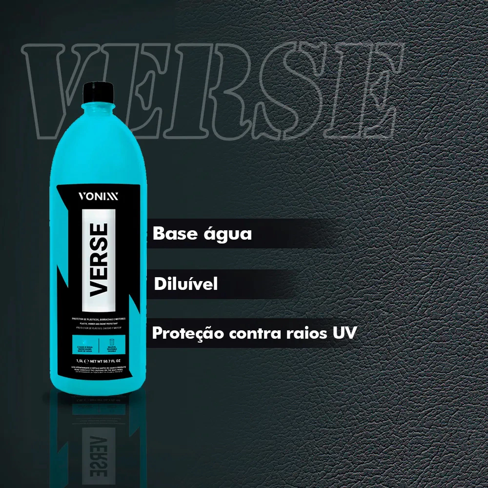 VERSE é um renovador de plásticos à base d´água que condiciona e protege o material contra raios UV. Pode ser usado em plásticos (pára-choques, painéis, laterais de portas) borrachas (caixas de rodas, mangueiras do motor, pneus e borrachas de portas) e superfícies metálicas, em especial o compartimento do motor e chassis. VERSE pode ser utilizado em diversas diluições, a depender da superfície e característica requerida.